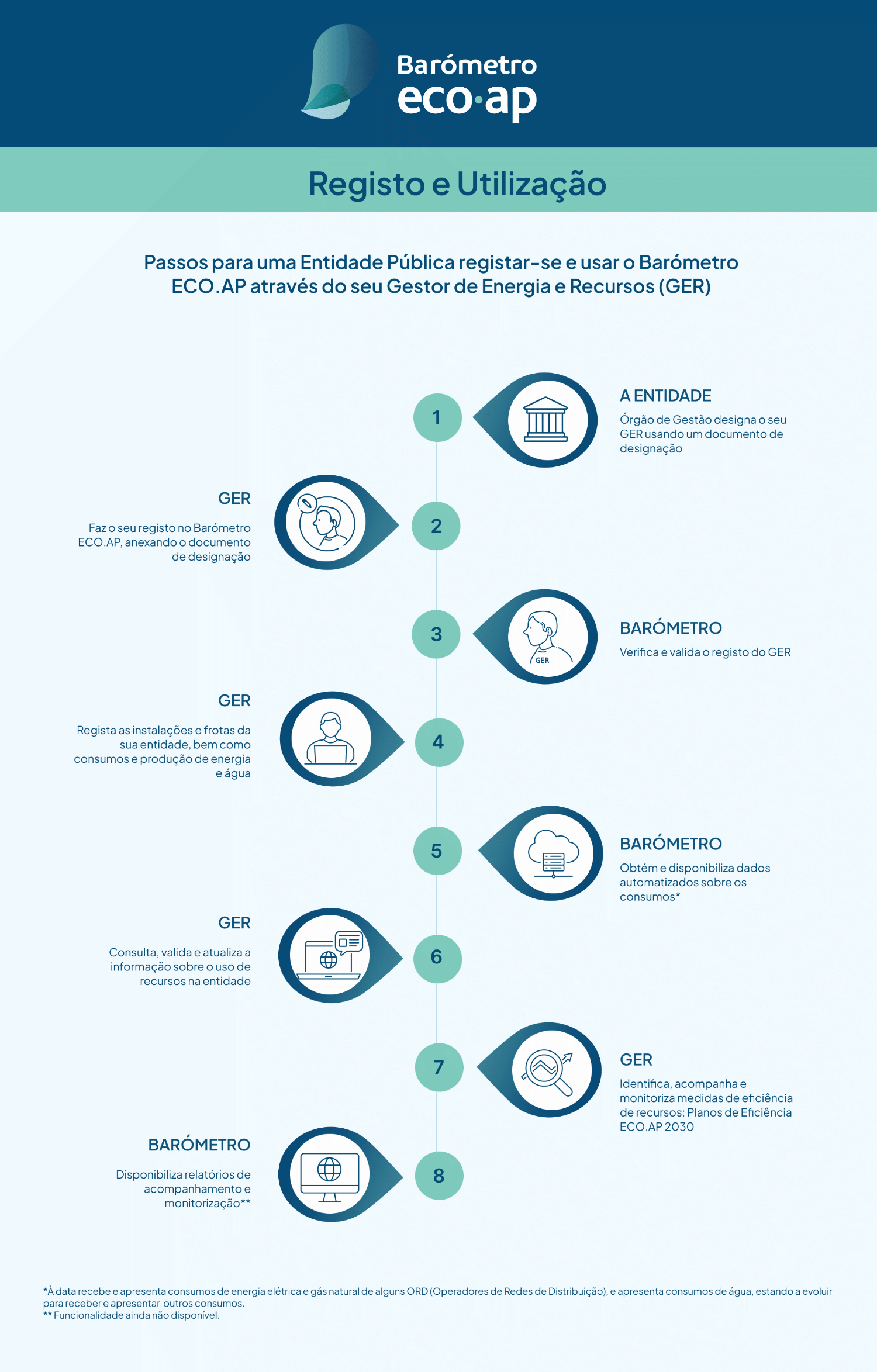 Outras entidades que não estejam enquadradas no âmbito do ECO.AP 2030, podem, a título voluntário, adotar e implementar as boas práticas do Programa e usar o Barómetro ECO.AP, desde que sejam entidades de carácter público e designem o seu Gestor de Energia e Recursos (GER).