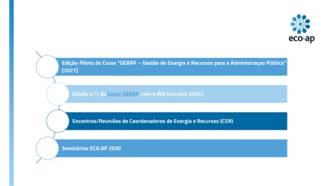Edição-Piloto do Curso “GERAP – Gestão de Energia e Recursos para a Administraçao Pública” [2021] Curso GERAP Edição n.º1 do Curso GERAP, com o INA [outubro 2024] Encontros/Reuniões de Coordenadores de Energia e Recursos (CER) Seminários ECO.AP 2030