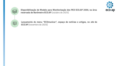 Disponibilização de Modelo para Monitorização dos PED ECO.AP 2030, na área reservada do Barómetro ECO.AP [outubro de 2025] Lançamento do menu “ECOmunicar”, espaço de notícias e artigos, no site do ECO.AP [novembro de 2025]