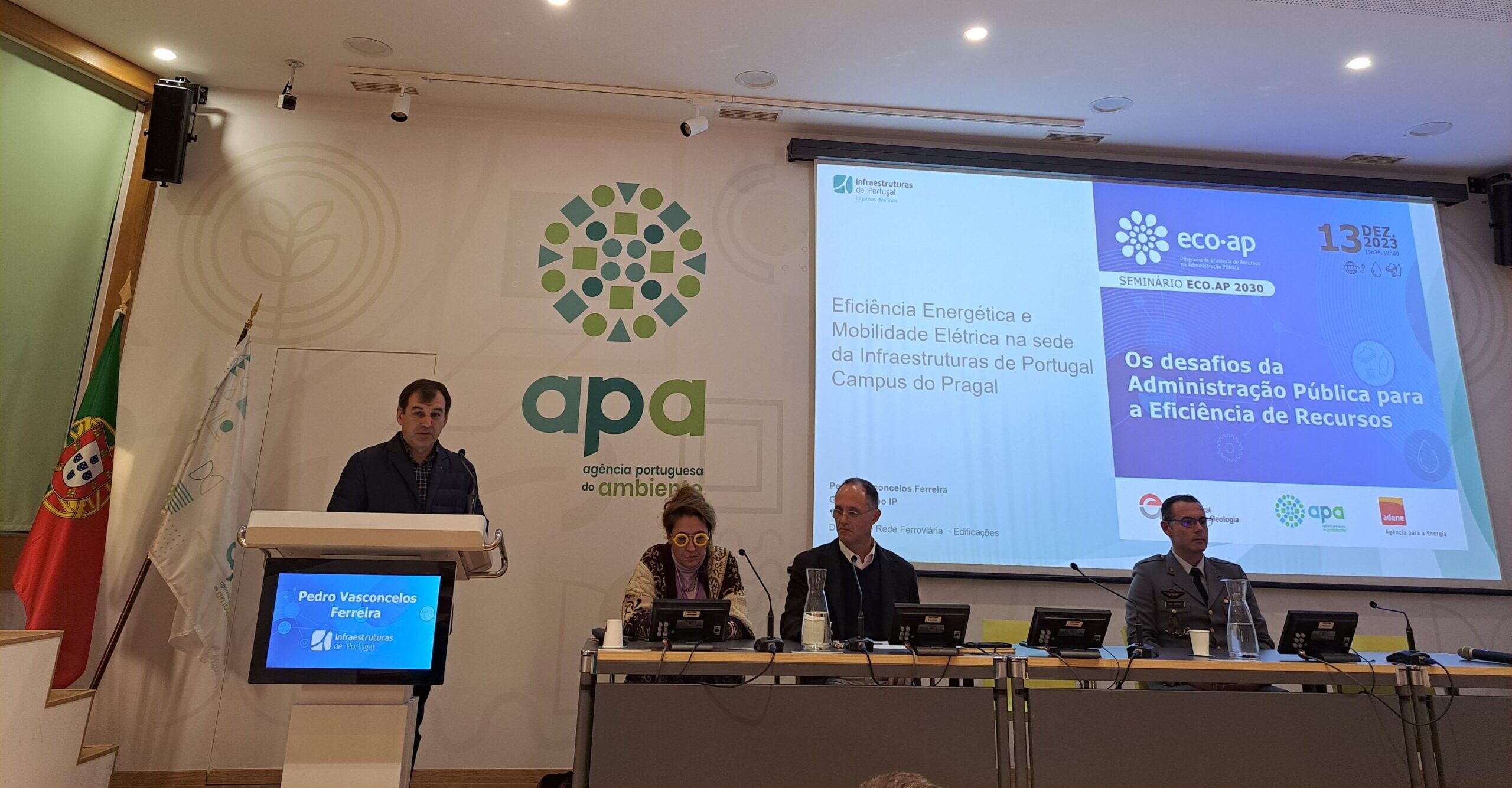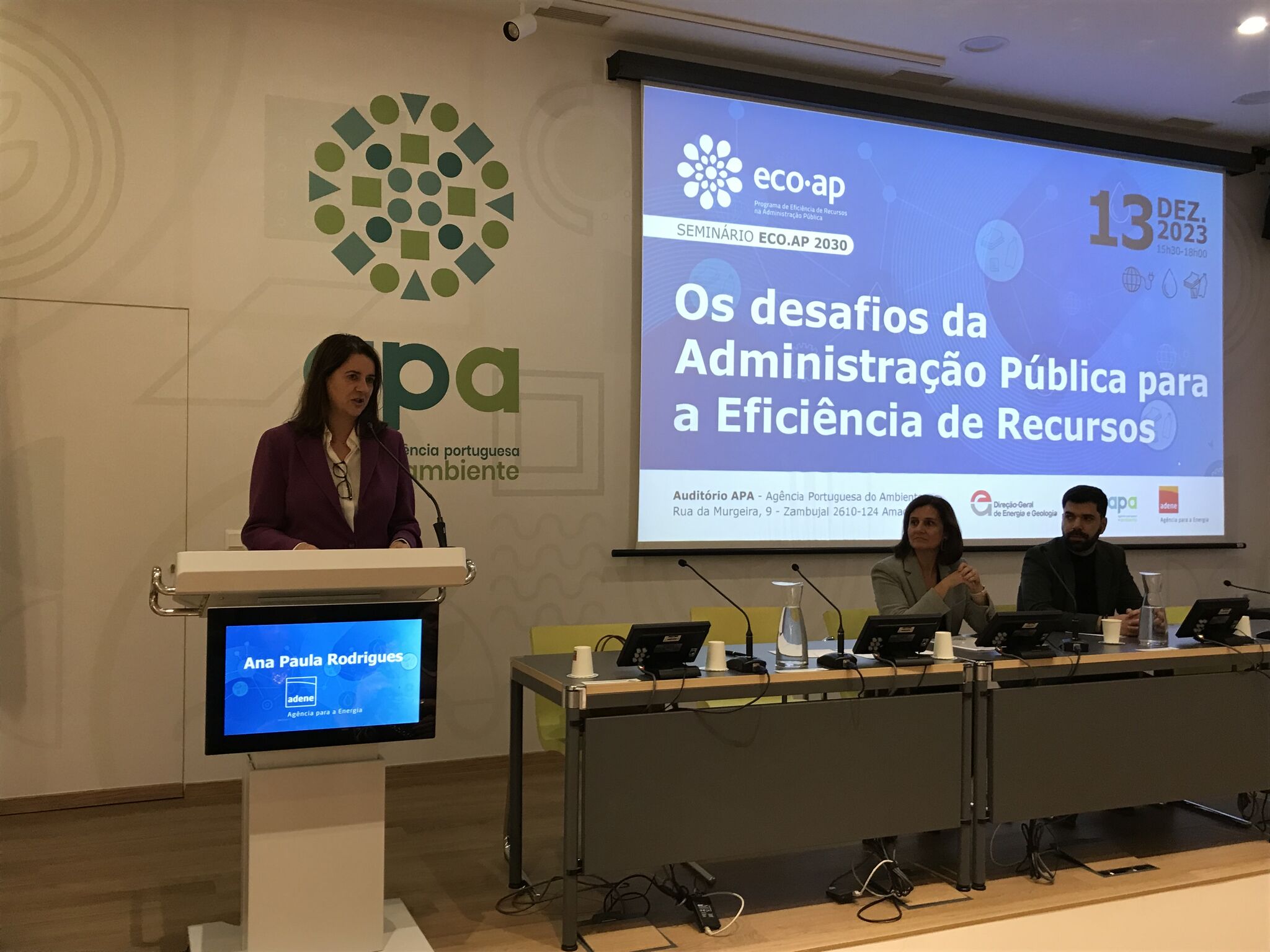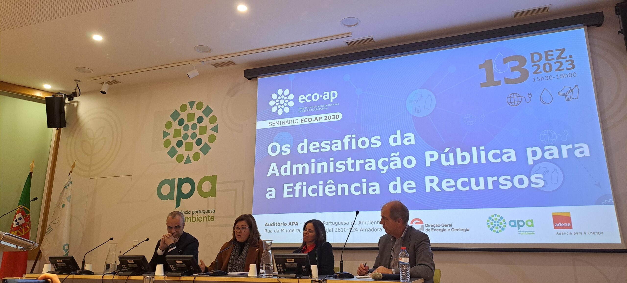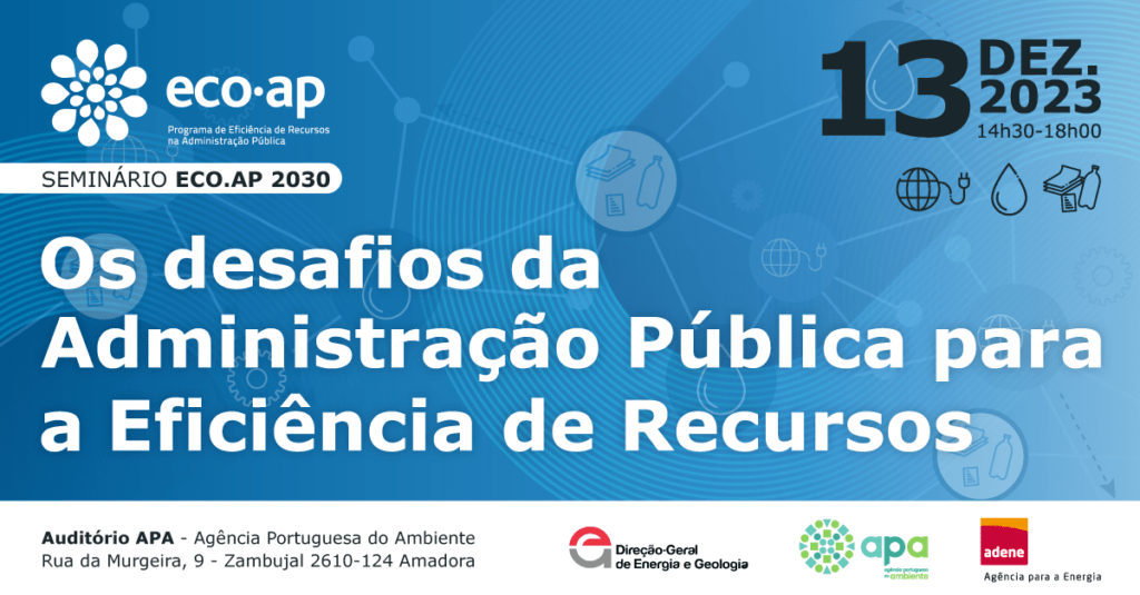 No dia 13 de dezembro de 2023, realizou-se o Seminário ECO.AP 2030: “Os desafios da Administração Pública para a Eficiência de Recursos”, que teve lugar no Auditório da Agência Portuguesa do Ambiente (APA), entre as 15h30 e as 18h30, e com transmissão online.